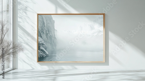 © Tahsin, Fototapeta premium Abstract coastal landscape painting featuring misty cliffs and serene waters