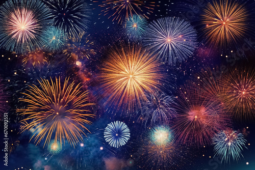 © Alexandra, Naklejka premium Abstract colored firework background, celebration and anniversary concept. Generative Ai