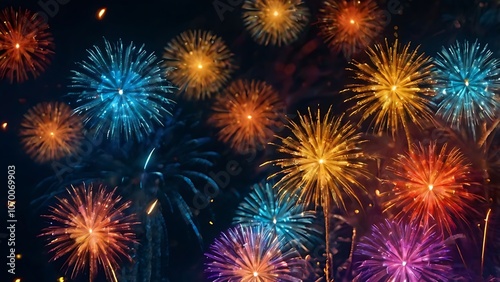 © nuttanicha, Fototapeta premium Abstract colored fireworks background with beautiful fireworks lighting up the night sky. Bokeh effect