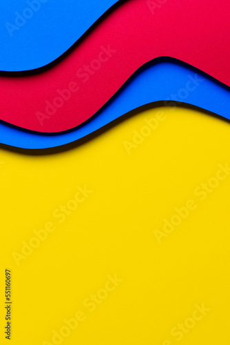 © vejaa, Naklejka premium Abstract colored paper texture background. Minimal paper cut style composition with layers of geometric shapes and lines in red and light blue colors on yellow background. Top view