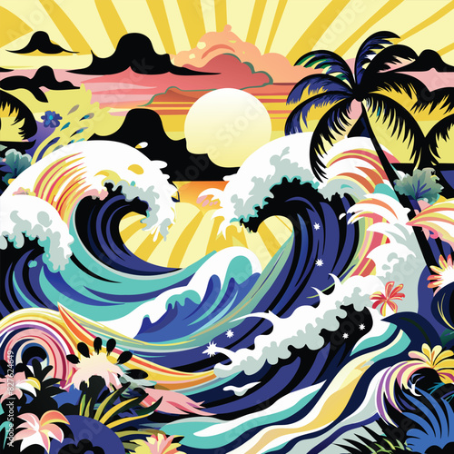 © Johanddss, Obraz premium Abstract Colorful Artwork Depicting a Tropical Sunset with Waves and Palm Trees