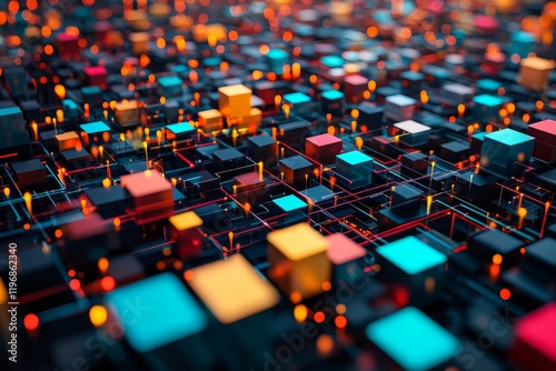 Obraz premium Abstract colorful blocks, glowing lines, interconnected network.