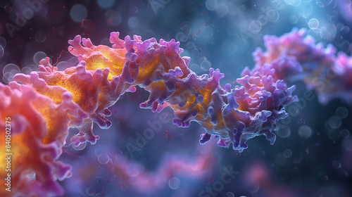 © VRAYVENUS, Fototapeta premium Abstract colorful chain, resembling a biological molecule, in a vibrant blue and purple background with bokeh effect.