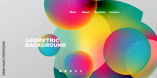 Obraz premium Abstract colorful circles overlap, creating vibrant design. Text labels present work, about, portfolio, contact options. Geometric background visible.