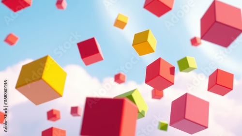 © sasiprapa, Obraz premium Abstract Colorful Cubes Ascending in a Serene Sky