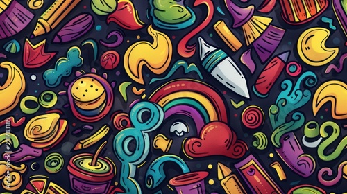 Fototapeta premium Abstract Colorful Doodle Pattern with Rainbow and Art Supplies