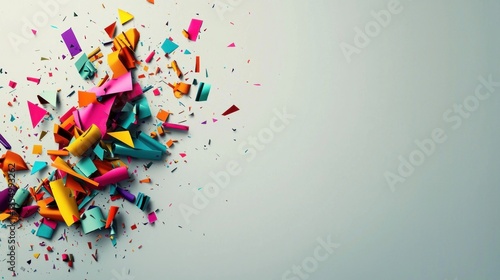 Fototapeta premium Abstract colorful fragments explosion on a light gray background. A dynamic display of vibrant, geometric shapes in various hues, seemingly erupting and scattered across a muted backdrop