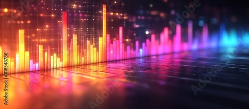 © Almahyra, Obraz premium Abstract colorful glowing bar graph reflecting on a dark surface.