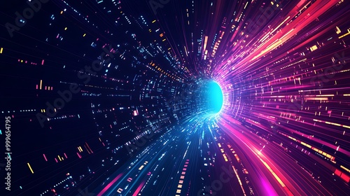 © Raffaza, Fototapeta premium Abstract colorful light streaks converging toward a bright blue circular portal in a dark background.