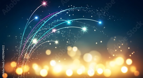 © Sajib, Naklejka premium Abstract colorful light streaks with sparkling particles on dark background
