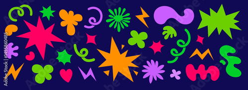 © Maxim Filitov, Fototapeta premium Abstract colorful shapes illustrations set. Retro cartoon style. Groovy funky clouds, flowers and bubbles shapes. Stars, loops and waves. Vector elements collection