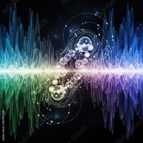Fototapeta premium Abstract Colorful Sound Wave Spectrum with Glowing Particles on Dark Background