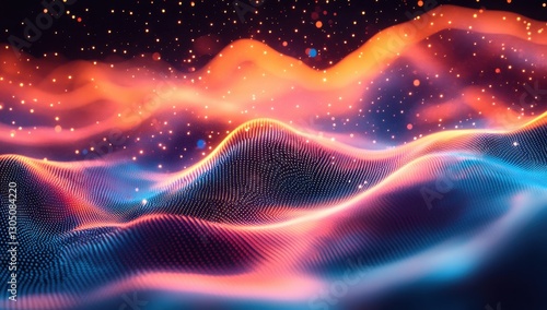 © Mardhiah, Obraz premium Abstract colorful waves with glowing particles creating a dynamic visual effect that evokes depth and movement in a mesmerizing digital landscape