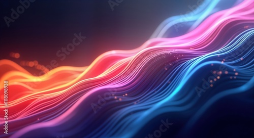 Fototapeta premium Abstract colorful wavy lines create dynamic 3d effect. Vibrant hues blend seamlessly. Modern design evokes futuristic tech vibe. Abstract shapes, colors ideal for background designs. Dynamic visual