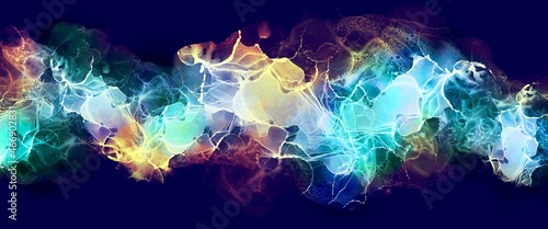 © phillipes, Fototapeta premium Abstract coloured bright alcohol ink background on the dark blue background, dreamy hand drawn art, fluid illustration texture, modern flashing wallpaper for print