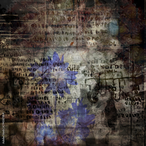 Fototapeta premium Abstract composition. Blue flowers on ancient symbols background