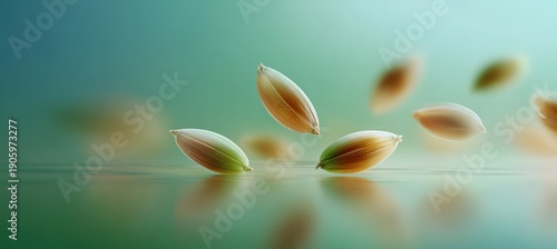 © spyrakot, Naklejka premium Abstract Composition of Sprouting Barley Grains on Pastel Green Background