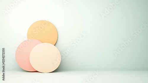 Fototapeta premium Abstract composition of three pastel circles against a soft green wall,...
