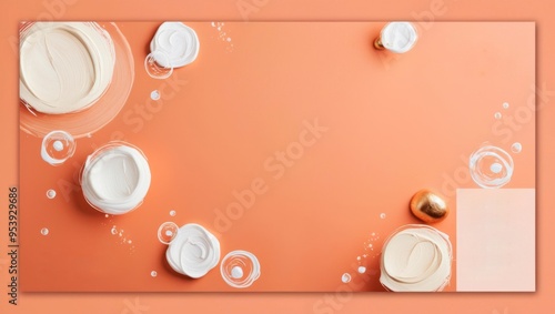 © StasySin, Fototapeta premium Abstract composition with white cream smears and golden element on a peach background