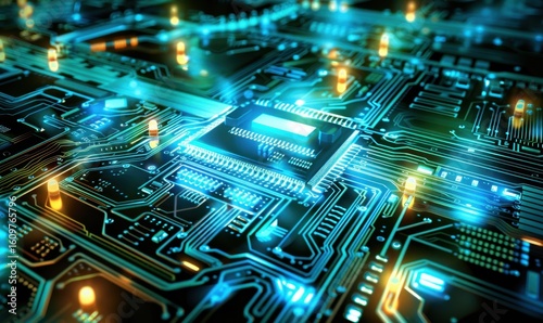 Obraz premium Abstract computer circuit board close up with glowing electronic pathways