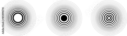Obraz premium Abstract concentric circle patterns creating optical illusion effects. Black and white radial line designs with vibrating, hypnotic motion. Minimal geometric backgrounds suitable for modern art.