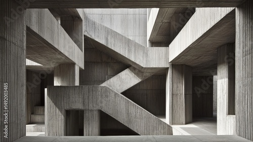 Fototapeta premium Abstract concrete interior design. Complex, angular, concrete structures, stairways