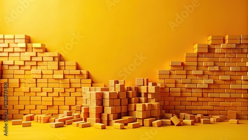 Fototapeta premium Abstract Construction Golden Blocks Forming Walls and a Central Pile on Vibrant Yellow Background