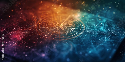 Obraz premium Abstract cosmic background featuring geometric patterns and celestial elements in vibrant colors, perfect for artistic and mystical themes.