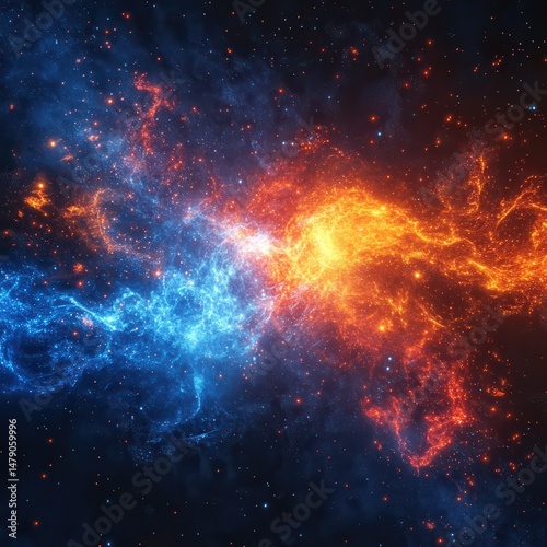 © Stock by Anika, Fototapeta premium Abstract Cosmic Energy Flow: Blue And Orange Glowing Particles In Space.