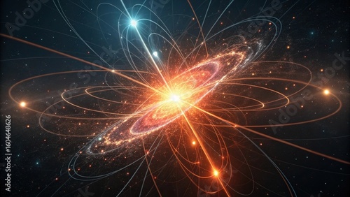 Fototapeta premium Abstract cosmic explosion with orbital light trails, representing a galaxy or atom.