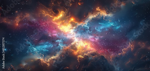 Obraz premium Abstract Cosmic Nebula with Explosive Colors and Star Clusters in Deep Space,...