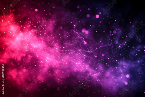 Fototapeta premium Abstract cosmic nebula with pink, purple, and blue hues, featuring a network of interconnected nodes and glowing particles.