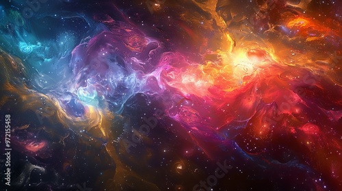 Fototapeta premium Abstract cosmic nebula with vibrant blue, red, and orange hues. The swirling...