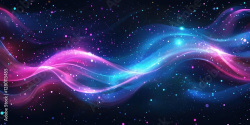 Fototapeta premium Abstract cosmic wave with pink and blue neon glow, glittering particles on dark background.