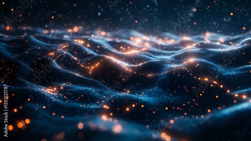 Obraz premium Abstract cosmic waves with glowing orange particles floating in dark space,...