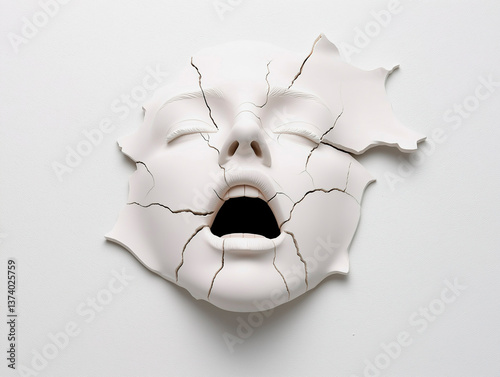 Naklejka premium Abstract Cracked White Face Sculpture on White Background