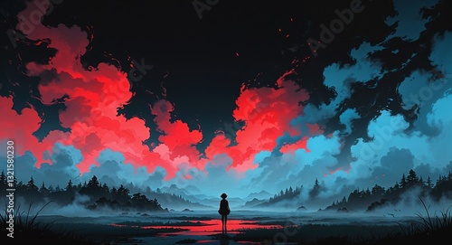 © Arceli, Naklejka premium Abstract cyan red fog mist anime on plain dark black background illustration