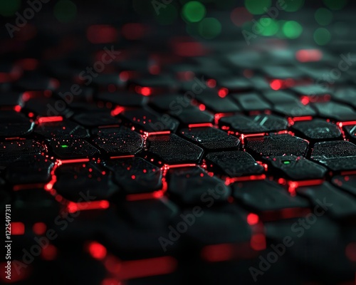 Obraz premium Abstract cyber grid showing vulnerabilities and defenses, glowing red and...