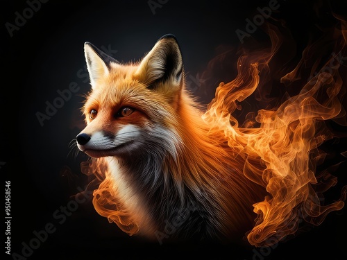 © Illustrations, Fototapeta premium abstract 3d background with red fox on black background, A scary fox face logo in the fire on a white background. A magical creature made of fire
