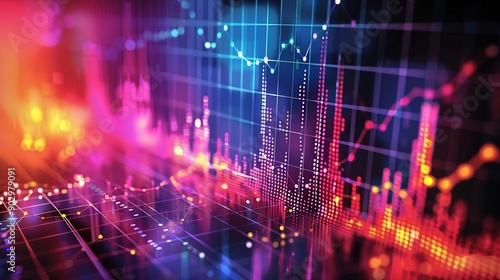© Vikarest, Obraz premium Abstract 3D Digital Grid with Colorful Data Graphs