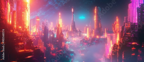 © NFTNexus, Naklejka premium Abstract 3D fractal background featuring a vibrant neon cityscape showcasing intricate designs and futuristic elements in a digital illustration