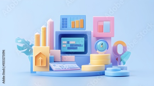 © HiSea, Obraz premium Abstract 3D Geometric Shapes with Blue Background Data Analytics Business Growth Digital Marketing