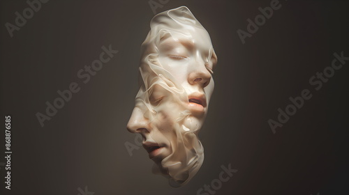 © xuxu, Naklejka premium Abstract 3D illustration, modern art, portrait of two faces with closed eyes floating in the air on a dark brown background. Surreal, face covered with fabric or cellophane, soft pastel colors, pale s
