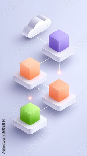 © STOCKJN, Obraz premium Abstract 3D illustration of cloud computing with colored cubes connected through a network on a light background.