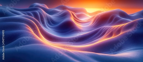 © Almahyra, Obraz premium Abstract 3D landscape with glowing waves at sunset.