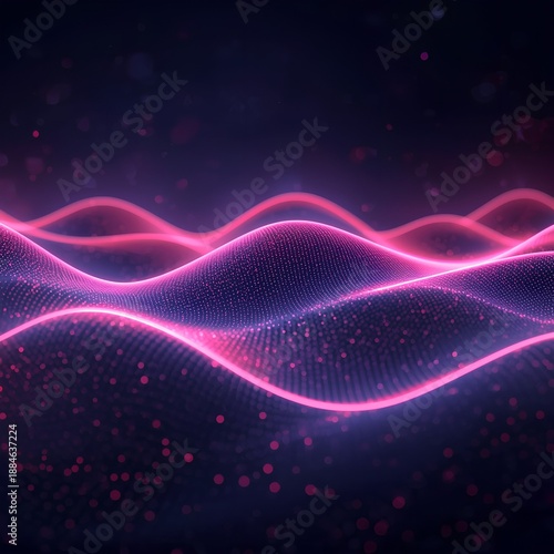 © Brooks, Fototapeta premium Abstract 3D Luminous Neon Pink Waves with Floating Particle Mesh on Dark Background