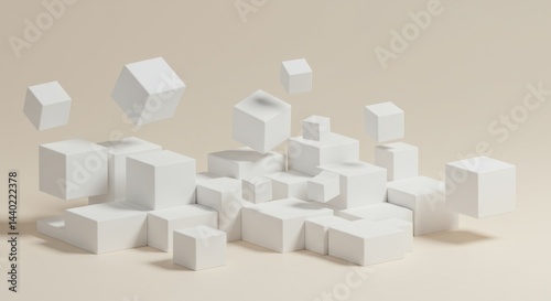 © popuo design, Obraz premium Abstract 3D Render: Floating White Cubes Minimalist Geometric Composition Beige Background