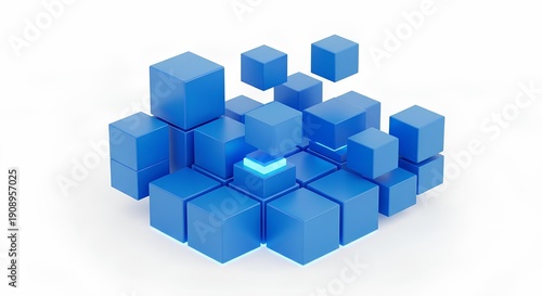 © gavi, Fototapeta premium Abstract 3D Render of Geometric Blue Cubes Forming a Data Structure or Network on a White Background