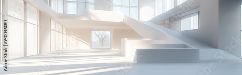 Fototapeta premium Abstract 3D rendering of a white multilevel interior public space featuring windows