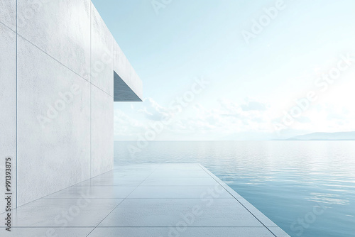 © fei, Obraz premium Abstract 3D rendering of minimalist style architectural space scene, mountain and lakeside building